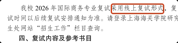 1 上海海关学院: 2026年各学科专业硕士研究生招生复试工作实施细则:明确“国际商务硕士,税务硕士,数字经济硕士”这三个专业采取网络远程复试。