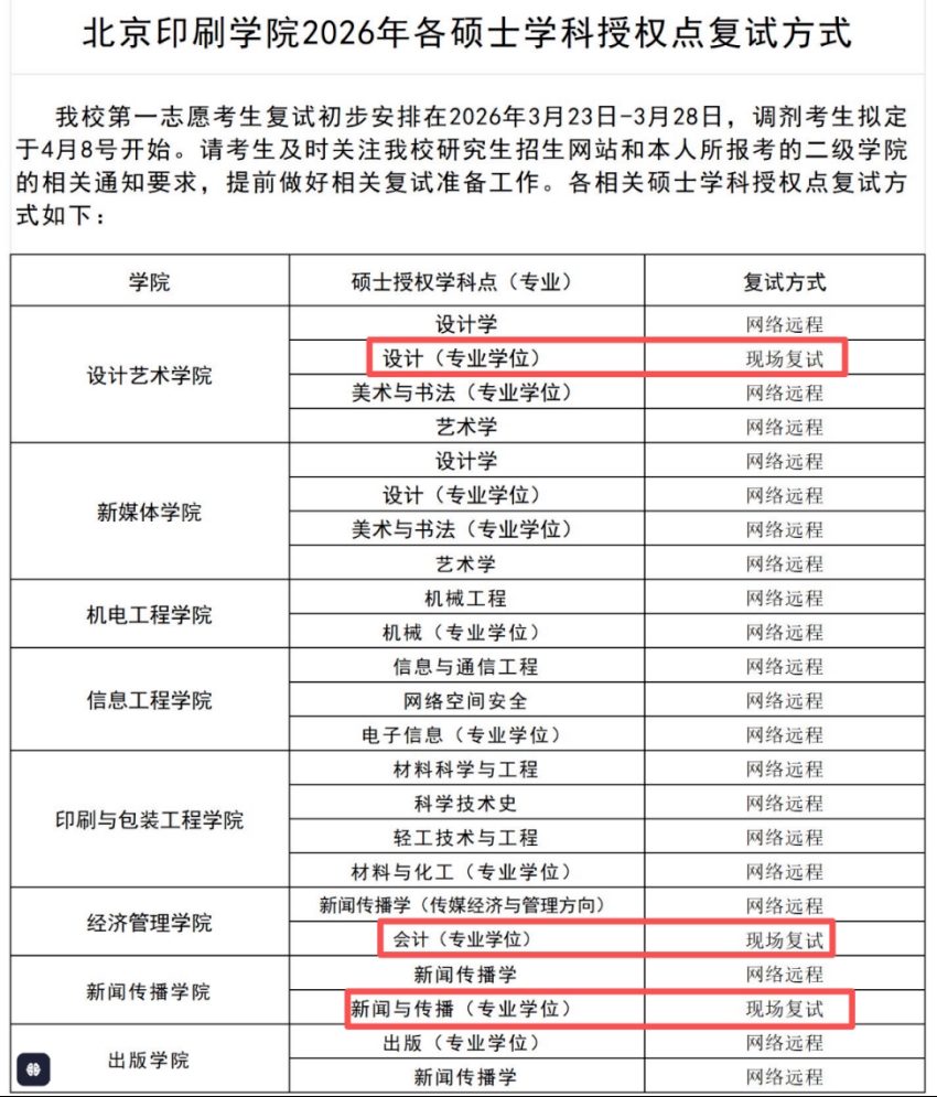 北京印刷学院2026年各硕士学科授权点复试方式:设计(专业学位)、会计(专业学位)、新闻与传播(专业学位)这三个专业需现场复试,其他专业均采用网络远程的复试形式。