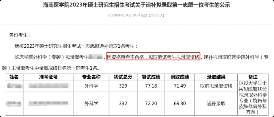 海南医学院2023年一位一志愿考生因资格审查不合格,被取消了拟录取资格。