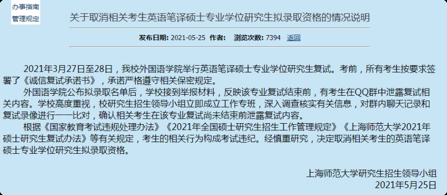 21年5月底拟录取后,有人取证举报上海师范大学复试泄题,相关30多名考生直接取消录取资格,这些学生甚至都办理了调档等手续了。