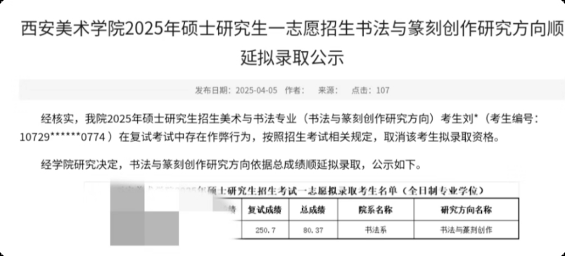 2025年西安美术学院发布了一则公示,公示说明原拟录取考生由于复试中有作弊行为(据说是作品集里作品涉嫌抄),因此取消该考生的录取资格,顺延录取下一名同学。