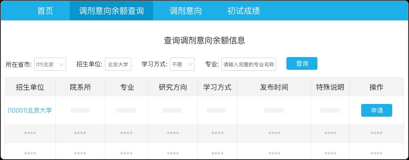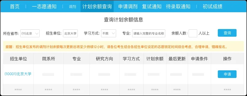 考生可在调剂服务系统开通前,了解招生单位发布的调剂意向余额情况。