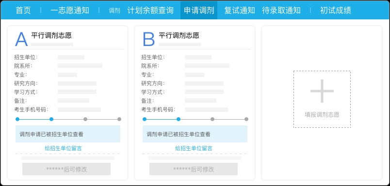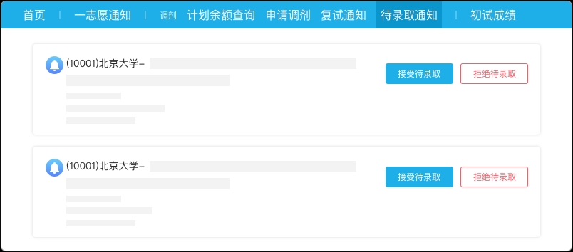 ①一旦确认接受待录取通知,即完成调剂流程,之后将无法再填报调剂志愿,或接受新的复试及待录取通知。